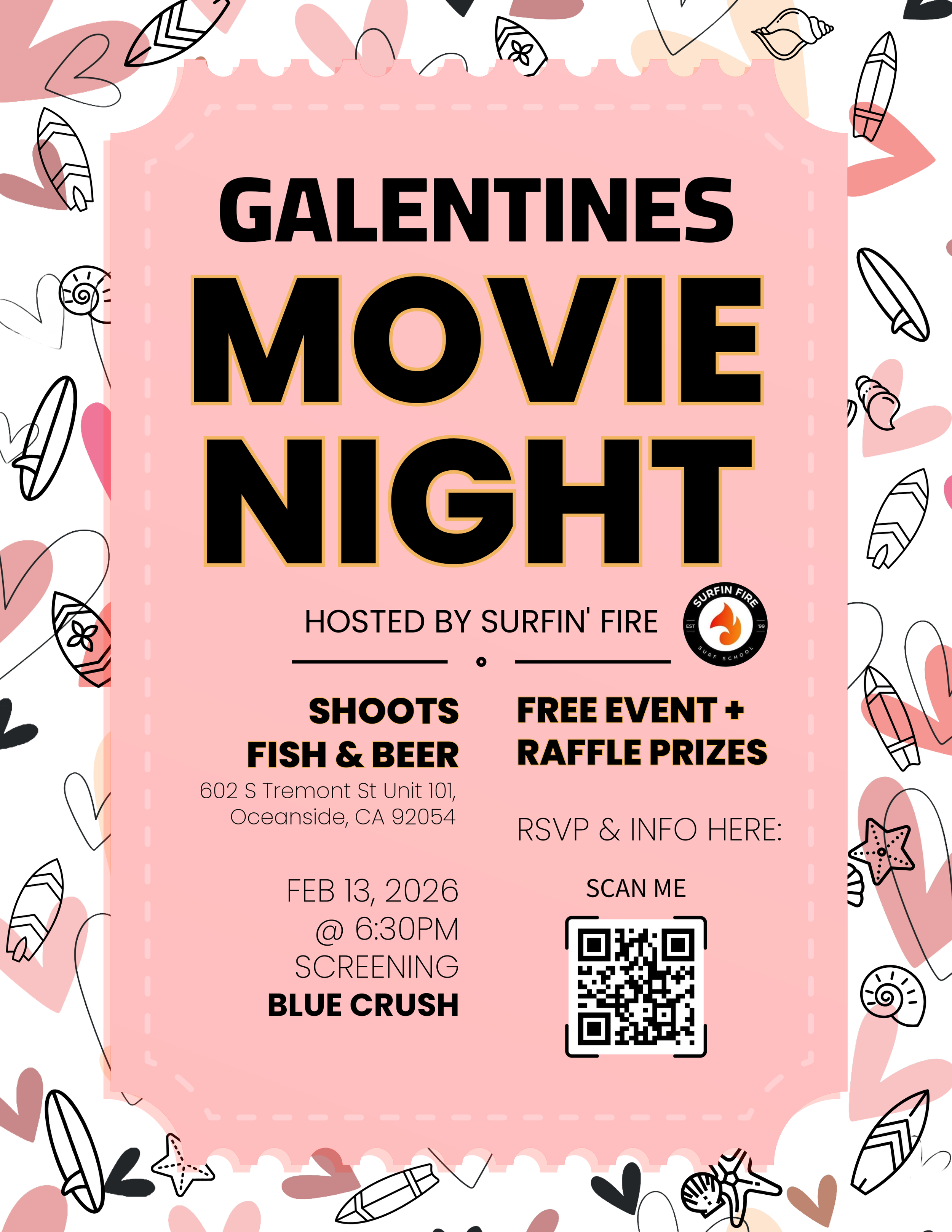 Join us for a fun and laid-back Galentine’s movie night celebrating friendship and girl power, hosted by Surfin’ Fire! Connect with ladies from the North County Women’s Surf Community, soak up the good vibes, and enjoy an outdoor screening of Blue Crush.