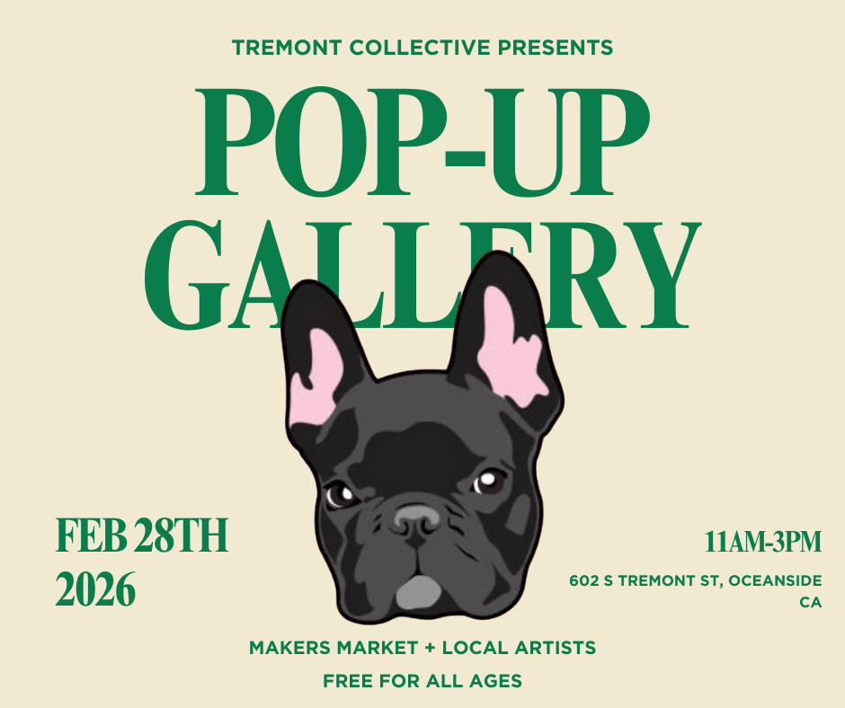 Join us at Tremont Collective for a Pop-Up Gallery Market celebrating local creativity, small brands, and community. Spend the afternoon browsing a curated mix of San Diego–based makers and artists, discovering unique goods, and soaking up good vibes in one of Oceanside’s favorite spaces.